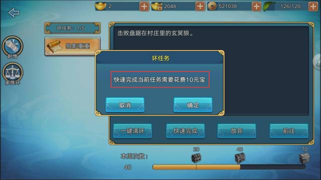 2、选择性秒任务:聊天的任务做起来很快,打怪的稍微慢一些,可以直接秒打很多怪物的任务(10元宝一次)。