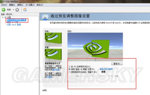 首先选择左方窗口的【通过预览图像设置】,然后在右方窗口选择【使用“高级3D图像”设置】