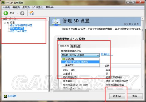 在右方的【全局设置页面】中,点击【首选图形处理器】的下拉列表,选择【高性能NVIDIA处理器】