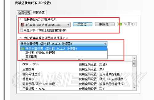 添加成功后,点击【为此程序选择首选图形处理器】的下拉菜单,选择【高性能NVIDIA处理器】