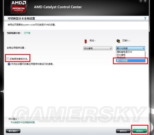【已插入】的意思是指笔记本插入电源的时候,假如你喜欢用电池运行笔记本玩游戏,【电池】那一边也要选择【最大化性能】
