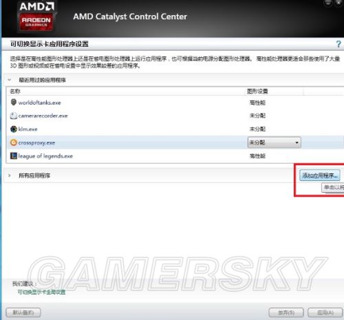 选择【程序设置】页面,然后点击下方的【添加】按钮。在弹出的程序列表中选择【穹之扉】的运行程序(假如列表中没有穹之扉的游戏运行程序,可以通过点击浏览按钮,制定穹之扉游戏运行程序路径)
