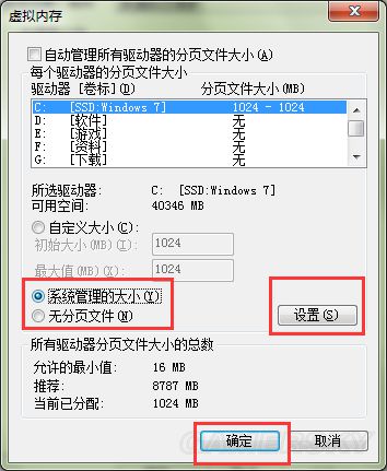 在弹出的【虚拟内存】窗口中,选择【系统管理的大小】,然后点击一下【设置】(注意一定要点击,点击生效)
