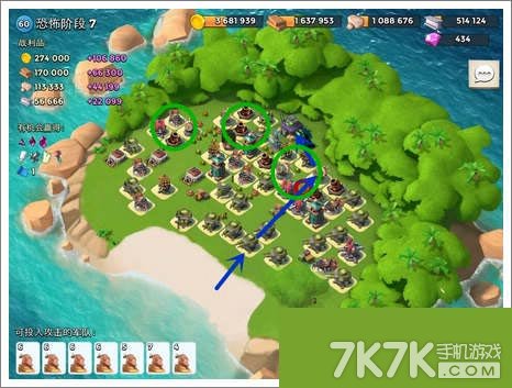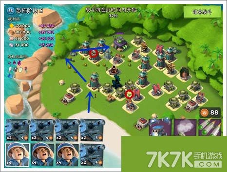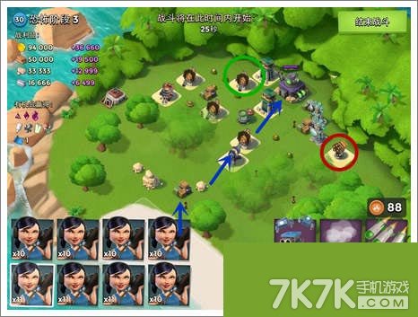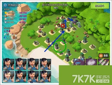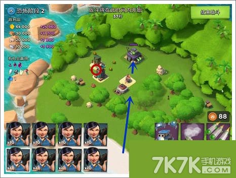 恐怖博士岛第一关使用的兵种是胖妹。胖子妹妹登陆后直线前进,直接炸掉狙击塔和导弹发射器,然后拆掉防御和箱子,完成。