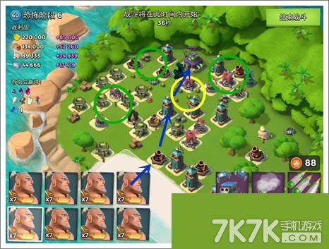 在第七关的整体难度不大,但是同样对野人有要求,要求16级以上,能量85。先用导弹爆掉高爆地雷,然后野人放烟掩护去基地,在防御建筑使用震爆弹,过关。