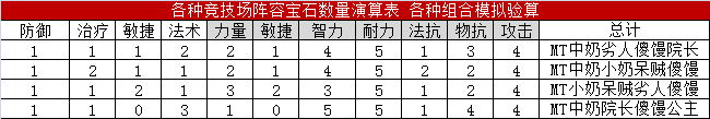 通过上表我们可以知道,要想把阵容英雄全部武装起来,我们需要3个力量、2个敏捷、5个智力、5个耐力、2个法抗、4个物抗、4个攻击,如果少于这个数量,那么就可能会有英雄没有带满宝石,超过这个数,就可以合成更高级的宝石了。