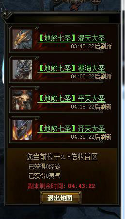 在副本中,击杀BOSS七大圣有几率掉落强化、坐骑丹、进阶石和太乙碎片。而击杀了BOSS的帮派,其帮派成员可以得到大量的帮贡奖励、道具、铜钱奖励及经验奖励。与此同时,该副本中相比较其他副本,拥有2.5倍的收益加成,在轻松打怪的同时还能获得大量的经验和灵气,福利相当不错。