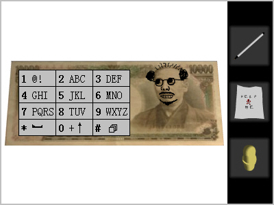 9、在电话机上拨号码 4357*63,听到“OK!”后(这里电脑的音箱一定要打开。听不到声音提示就无法继续玩了!),查看黄色瓶子,将1万日元放入。将黄色的瓶子放进管子里,按旁边红色的按钮,这时会像前面一样把瓶子送走。