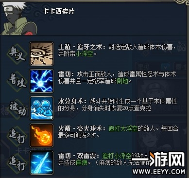 这个阵容的核心要点就是其它召唤单位,只有卡卡西的分身,第一回合卡卡西分身死掉,恢复20查克拉,加上初始查克拉,左近右近直接可以放奥义,而且这个技能是无视目标单位的,外加减防效果。第二回合土遁追牙之术是纯体术伤害,这个意义不言而喻。
