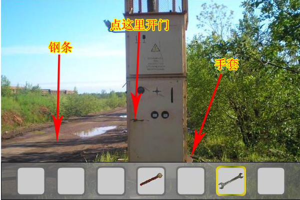 4、连续点二次左边,进入第四个场景,在配电柜右下角,工具栏上面一点的位置拿到手套。
