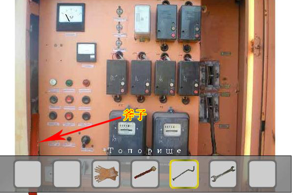 6、用扳手点下钢条变成一个钩子, 用钩子点配电柜下面门中间靠左的那个横纹打开配电柜, 在左边门缝拿到红色斧头。
