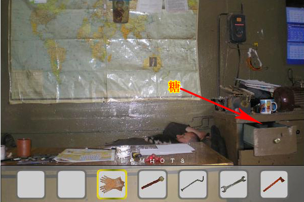 7、回到第一个场景, 打开左边的抽屉,用手套拿出糖。