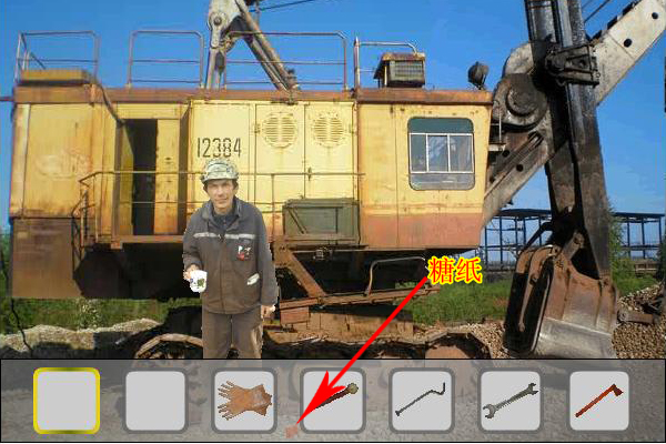 8、左转到第三个场景,把糖给那个老头,转到别的场景再回来,在地上捡到红色糖纸。注意:糖纸是被工具栏挡住的,在工具栏第三格和第四格两个下角的中间。