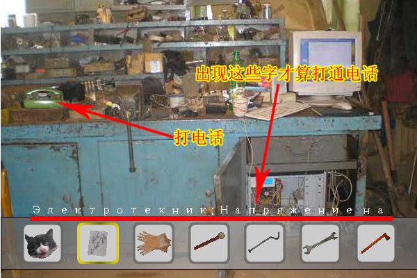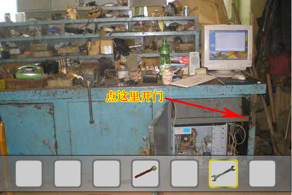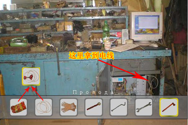 9、右转到回到第二个场景, 用斧头点显示器下面打开的柜门里面的电线,得到电线。