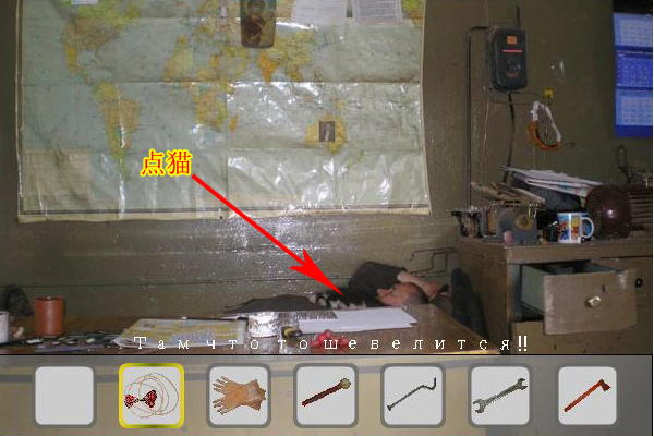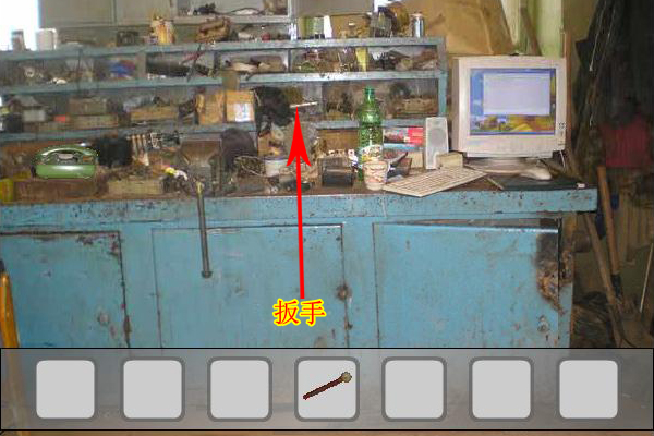 2、退回第一个场景,点左边进入第二个场景,桌上架子第二格的中间,一团黑东西的右边拿到扳手。