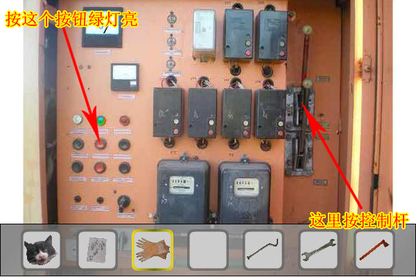 13、左转二次到第四个场景, 用钩子打开配电柜门, 把红色控制杆装在右上方洞内。