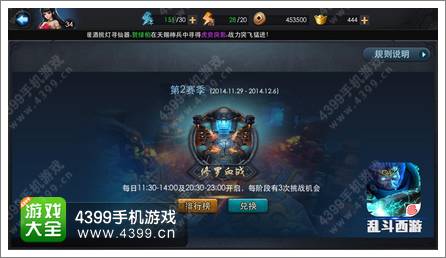 作为一项全新的PVP玩法,修罗血战的玩法规则并不复杂:在每天中午的 11:30-14:00和晚上的20:30-23:00,系统会在“奇遇”界面开放“修罗血战”通道让玩家进入,并为玩家匹配一名实力相当的对手:经过四 回合对战后,系统将根据战斗比分结果和玩家角色等级进行胜点数评分,并通过胜点数对玩家进行排名。