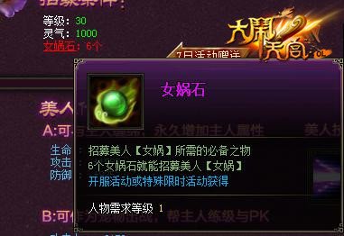 在大闹天宫ol中玩家可以通过与美人缠绵合体来获得永久性属性增加。作为上古首领,如果玩家同女娲合体,那就犹如神灵附身。在大闹天宫ol中女娲美人可谓是PK下副本的法宝。招募女娲需要等级达到30级,需要灵气1000,女娲石6个。其中女娲石是最为重要的。