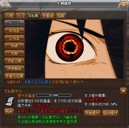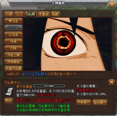 双勾玉升级的时候需要两张写轮眼灵符,而100%成功祝福值需要150,遗憾的是orz游戏用尽了所有的点券也没能升级成功,可见想快速的修炼写轮眼还是要借助RMB。