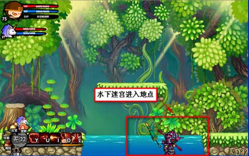 当你顺利的获得避水珠后再次进入神兽森林,在第三波小怪的位置上有一处河流,进过造梦西游中隐藏副本的朋友一定不会陌生,这个水处按下键加跳跃(S+K),这样就可以进入水下迷宫了。