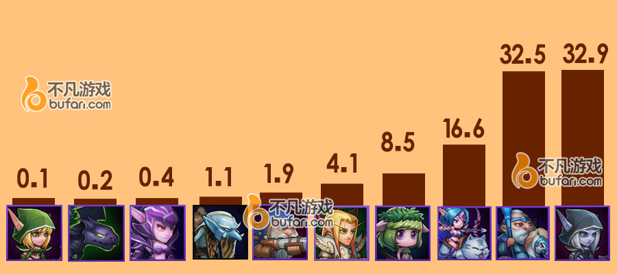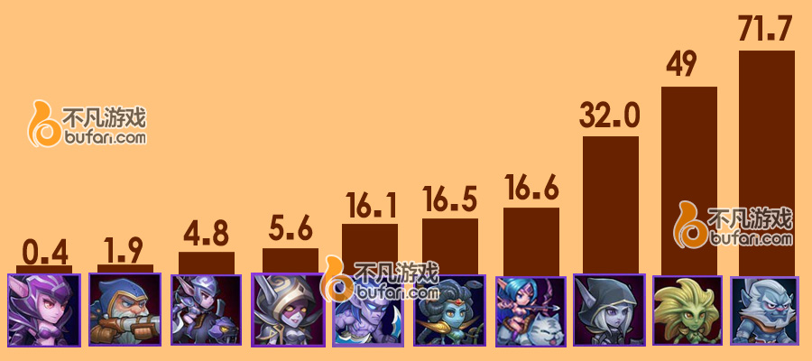 敌法光辉已逝,猴子一跃成为菜刀队超级VIP,无论是分身的干扰能力还是自身的输出能力都十分出色,你永远不会忘记单体爆发英雄大招打在猴子分身身上的 那一刻是多么的窘迫(说你呢,火女)。小娜迦也凭借觉醒后获得的闪避增加分身的觉醒技成为出场率近乎50%的前排。土豪英雄圣堂刺客仅有5.6%的使用 率,当然这也和拥有它的玩家过于稀少有关。想必剑圣那种影都见不到的魂匣英雄,圣堂刺客已经好了太多