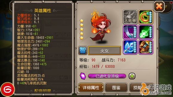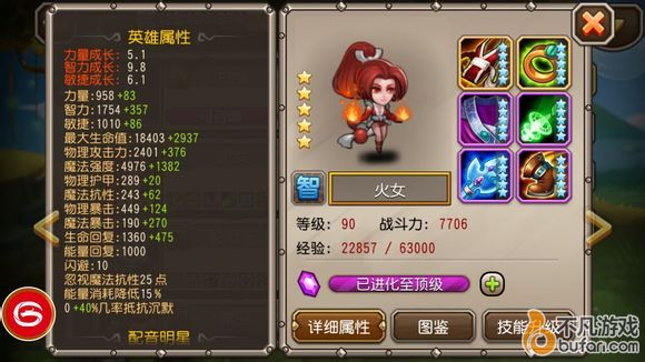 觉醒后血量变化很小,魔法强度提升到6300+,护甲无大变化,魔法暴击提升到了460(超过了觉醒莱恩,为刀塔传奇第一高法爆),其他无明细变化。可 以看出觉醒火女觉醒继续强化了输出,觉醒技能和四技能的调整让火女输出明显上了一个档次,但是并没有解决火女自身生存弱的问题。普通竞技场由于敌法一姐月 骑圣堂的存在火女脆皮身板很难有发挥余地,猴子的分身容易让火女大招无功而返。不过新的巅峰竞技场火女如果能配置好队伍也会有非常出色的表现(由于火女觉 醒法爆超高,龙破斩和光击阵,打一般的物理基本必爆,清理猴子的前排分身很犀利。火女的队伍打现在非常流行的蓝胖娜迦国家队有很好的胜率。 )下面是火女觉醒装备属性
