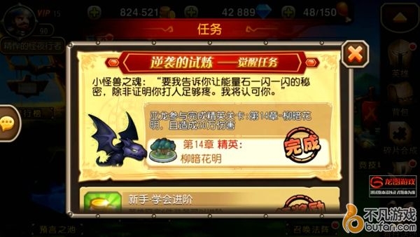亚龙觉醒任务第三关:参与完成精英关卡第14章-柳暗花明,且造成20万伤害。这个任务不是很难,亚龙强大的持续伤害能力完全可以打出20W伤害。