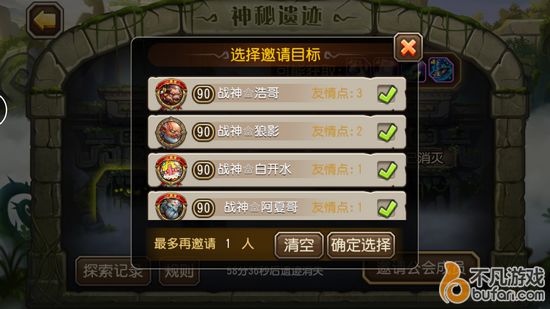 其余两处需要要求公会成员来攻打完成,最多可对五人发送邀请,并且邀请后不能再更改,同时神秘遗迹只存在一小时,所以邀请人的时候要选择好,最好提前在群或者公会群确认都谁在线,之后再邀请。