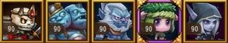 打法:蓝胖的第1个嗜血术给小黑,抗伤害用猴子的技能,小黑的冰剑用来减速,神灵第1个大招给骷髅,第2个给蓝胖,第3个给猴子,第4个给小鹿,然后小黑用大招收割。骷髅要吃第1个大招,所以最好是橙色品质,利用猴子的分身骗,骷髅miss抗也就没问题了。