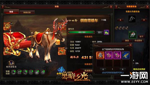 黑暗之光骑兽装备属性,将额外的装备部件穿戴至对应的副装备位上,装备属性将按照一定的百分比转化至骑兽属性。从背包中筛选出高等级的装备部件进行穿戴,可大幅提升属性加成,收集套装更可获得套装属性。