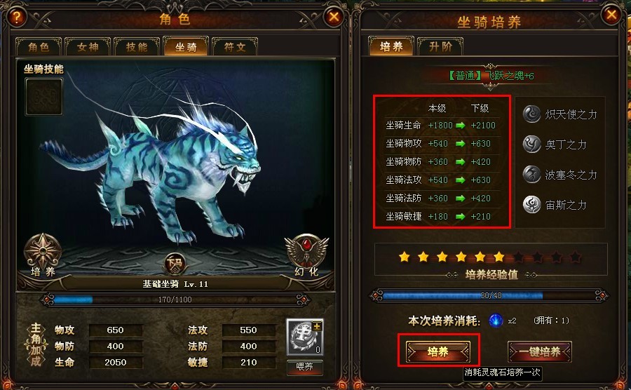 如果坐骑培养到一定星级后,不仅会提高坐骑的品质,玩家还可以过的更多的属性加成,为了玩家的方便,坐骑培养液存在了一键培养,通过一键培养,系统每次消耗灵魂石都是直接从玩家的背包中消耗。