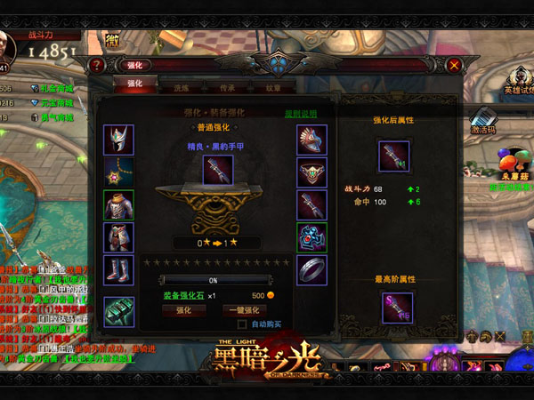 《黑暗之光》的装备强化功能分为普通强化和极致强化。普通强化,消耗装备强化石和金币,提升装备的属性。在玩家的记录中,以裤子为例,一件20级蓝 色精良品质的牦牛护腿战斗力为50,基础属性为防御+30,附加属性为魔法+5、闪避+6。再点击强化按钮消耗两颗装备强化石和1000金币后,会给予护 腿战斗力+3、防御+2的属性加成,星级会提升到1星。
