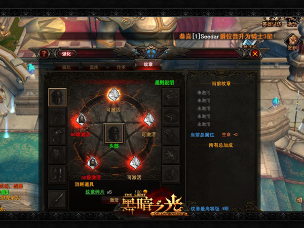 纹章功能,要先激活相应的装备纹章并升级,纹章等级最高,装备属性加成也就越高。以头部纹章为例,激活要该部位第一个纹章需纹章碎片5个,激活后属 性加成生命500,战斗力+5。随着纹章等级的提高,升级消耗的纹章碎片越多,属性加成亦呈倍增长趋势,比起积攒能量槽的玩法,升级纹章可是一次就可以成 功的,五个纹章孔位随着角色的等级逐一开启。