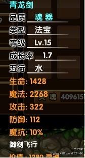 成长1.7的青龙剑在15级时:生命1428、魔法2268、攻击力322、防御112、魔抗+10%
