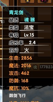 成长2.4的青龙剑在15级时:生命2856、魔法2016、攻击力462、防御168、魔抗+10%