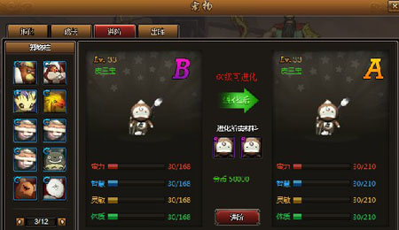 首先选择消耗料,选两个与需要进阶的宠物相同的宠物作为进阶材料消耗。即宠物B品质“皮三宝”进阶时需要消耗两个B品质“皮三宝”才能完成进阶。也就是说,需要两个B品质的“皮三宝”换取一个A品质的“皮三宝”。进阶后宠物品质提升一阶,且资质上限大幅提升。进阶后宠物的等级上限也会上升。