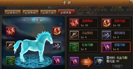 坐骑装备一共有六种,他们最高能提升10级,每件坐骑装备只有一条新属性,该属性随装备的等级提升而提升。不过,坐骑装备升级也是有条件的,那就是坐骑兽魂必须到达一阶,装备才能提升。